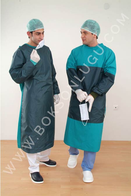 Ön kısım ve kollar yarıya kadar sıvı geçirmez 134C otoklava dayanıklı koruma kumaş ile kaplanmıştır.